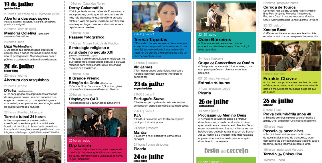quatro em quatro anos, em Riachos, vai ter lugar de 19 e 30 de Julho e o programa já está definido. A vila ribatejana vai ter diversas actividades, que vão desde a música, até ao desporto, passando por exposições, tauromaquia e gastronomia, preenchendo os doze dias de festa.